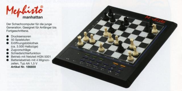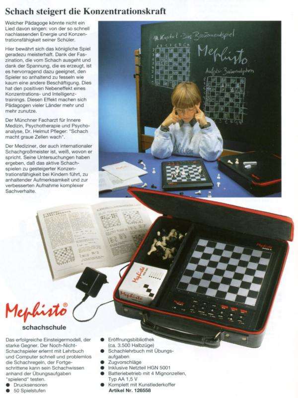 bestehenden Schachkurs nutzt. omputern mit Morsch-Programm enthalten, z. B. Mephisto Maestro Travel Chess Computer, Mephisto Schachschule II und Saitek Cosmic . Mit der maximalen Rechentiefe von 16 Halbzügen kamen in der Schachakademie eher die Gene der Saitek GK2000-Reihe zum Zuge. |